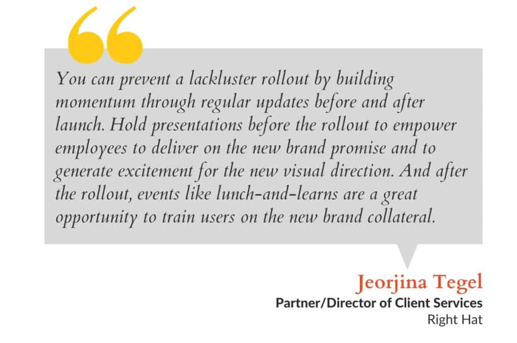 You will need a clearly defined rebrand committee made up of key stakeholders. Waiting on approvals before moving to the next stage can really hold up your timeline, so I also suggest having a discussion with your approvers upfront about how the committee should handle these kinds of delays. Maybe everyone will agree that if you get four out of five approvals, you can move ahead. I recommend recording sign-off stage presentations (using Zoom, etc.) if you don’t get a full roster to attend your milestone meetings, or you can always use a recording tool like Camtasia to send no-shows the information they missed.